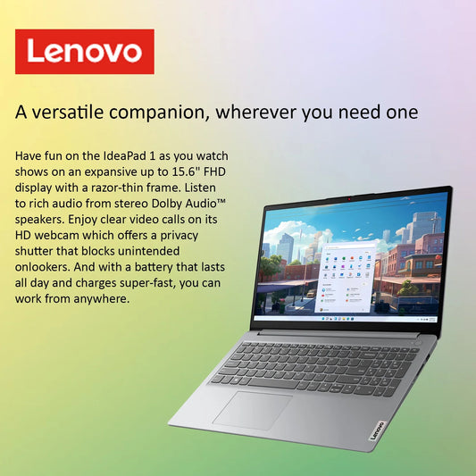 Lenovo IdeaPad 1 Student Laptop – 15.6” FHD Display, Intel Dual-Core, 8GB RAM, 128GB SSD + 128GB eMMC, Wi-Fi 6, Office 365, Windows 11 Home, Grey