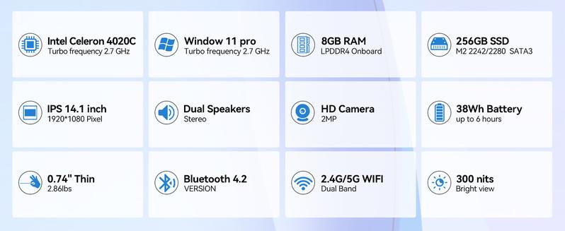 🚀 Powerful Performance: Equipped with an Intel Celeron N4020C processor (Turbo frequency up to 2.8 GHz), Intel UHD Graphics 600, and Windows 11 Pro for fast computing.