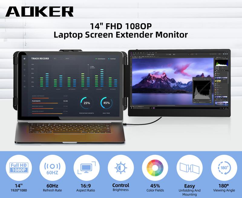 AOKER 14“ Dual Laptop Screen Extender FHD IPS 1080P High Resolution Portable Travel Monitor Compatible with Windows Mac Phone PS5
