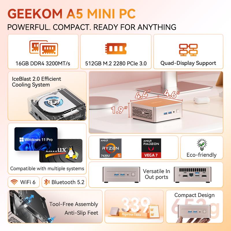 Powerful AMD Mini Desktop PC GEEKOM A5 mini pc is powered by AMD Ryzen 5 7430U processor. With pre-installed Windows 11 Pro