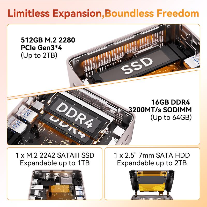 [16GB RAM 512GB SSD, Upgrade Friendly] The GEEKOM A5 features 16GB dual-channel DDR4 RAM and 512GB PCIe 3.0x4 NVMe SSD