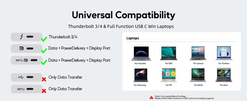 - GIGABIT ETHERNET & PD CHARGING & WIDE COMPATIBILITY - The RJ45 Gigabit Ethernet port provides stable, high-speed wired internet, to download movies faster and enjoy gaming without lag. while the USB-C PD port supports up to Max 100W input & Max 85W safe output into your laptop. The laptop usb-c dock is compatible with most Thunderbolt 4/3, USB4, and full-featured USB-C Windows / ChromeOS laptops(support Power Delivery, Data Transfer and Display Alt Mode). NOTE: It is recommended to use a power greater than 65W to ensure stable power input for your Macbook/Laptops.