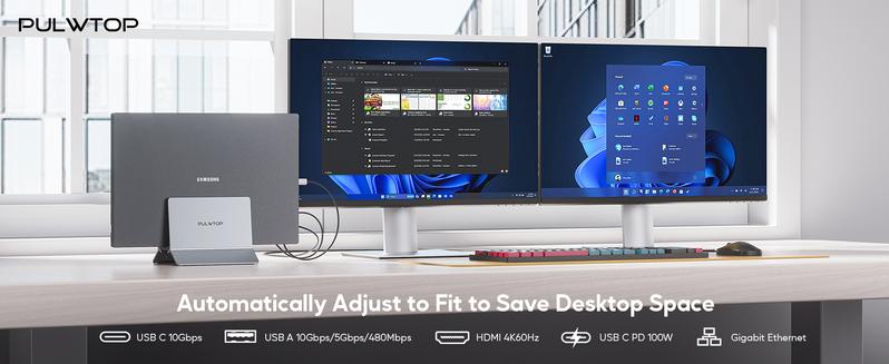 - LAPTOP DOCKING STATION WITH COMPREHENSIVE CONNECTIVITY - PULWTOP laptop dock for dual displays features 2 HDMI 4K@60Hz, 2 USB C Gen2 10Gbps, USB A Gen2 10Gbps, 2 USB 3.0 5Gbps, RJ45 wired Gigabit Ethernet, USB A 2.0, USB-C PD100W and USB C to host port. Effortlessly supports 2 external monitors for full HD movies, games, office meetings, and entertainment, while providing enough ports for mouse, keyboard, and other most USB A/C peripherals. NOTEs: 1). PD power adapter is NOT included. 2). To ensure all functions work stably, please connect a PD power adapter greater than 65W to the "USB C-PD" port on the dock