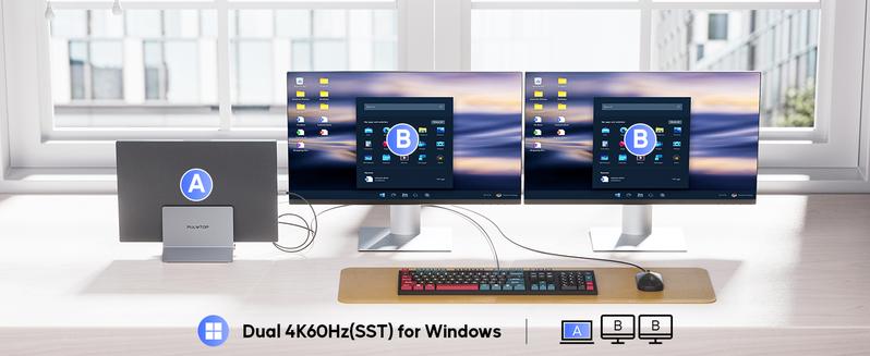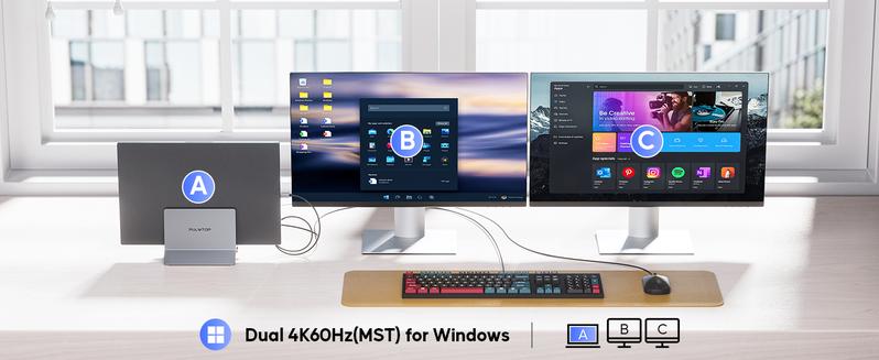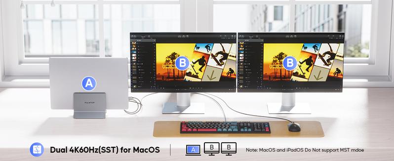 - DOCKING STATION STAND DESIGNED FOR DUAL MONITOR - Listen to our customers' need for dual-display output, we designed this Dual Monitor Laptop Dock. This USB-C Dock supports SST(ABB / AAA) or MST(ABC) mode on Windows Laptops for extending/mirroring 2 monitors simultaneously. Start to enjoy breathtaking 4K@60Hz high resolution (DP1.4 Laptop) with astonishing clarity for a truly thrilling and immersive working experience. NOTE: Due to the limitations of Mac OS, this docking station is not compatible macbook/macbook pro and will NOT split screen.